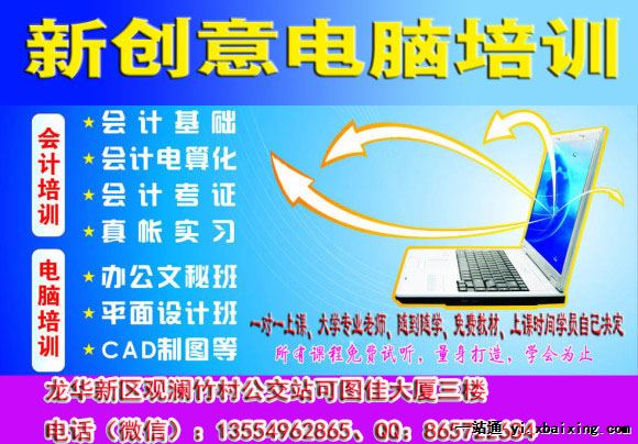 深圳观澜、大和、田背、观澜人民医院观澜新创意培训:会计从业资格培训:(课程:会计基础、电算化,财经法规三本书) 地址: 观澜大道竹村公交站下车即到亚翔厂大门口(可图佳大厦三楼3028室)