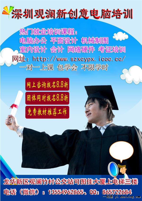 2015年观澜附近最专业、最好培训的电脑培训学校——新创意培训、培训课程全面更新、与实际相接合、全真实操、手把手一对一上课、大量练习与工作对接、学完就能上岗,免费教材、推荐工作,电话:13554962865,QQ:865722684