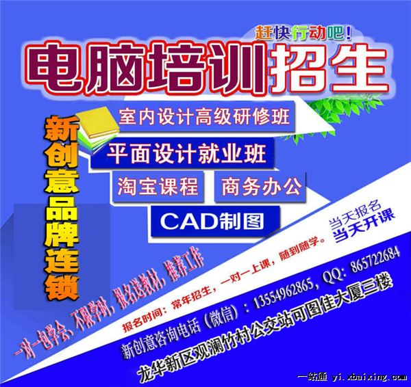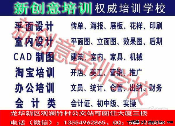 深圳观澜大和、田背、福民路口、观澜人民医院新创意电脑办公、平面设计、广告美工设计、室内设计、CAD绘图、会计培训课程全面升级,全新课程,与时代同步,学会为止,不限学时,随到随学,上课时间自己确定。